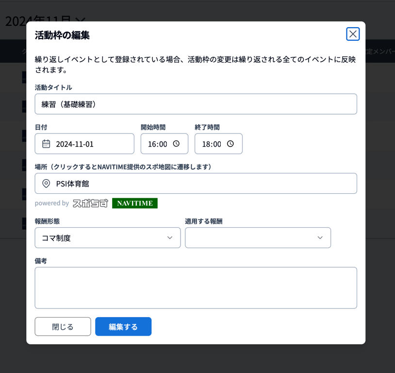 活動一覧の編集したい予定の横にある「︙」をクリックし、「編集」をクリックする