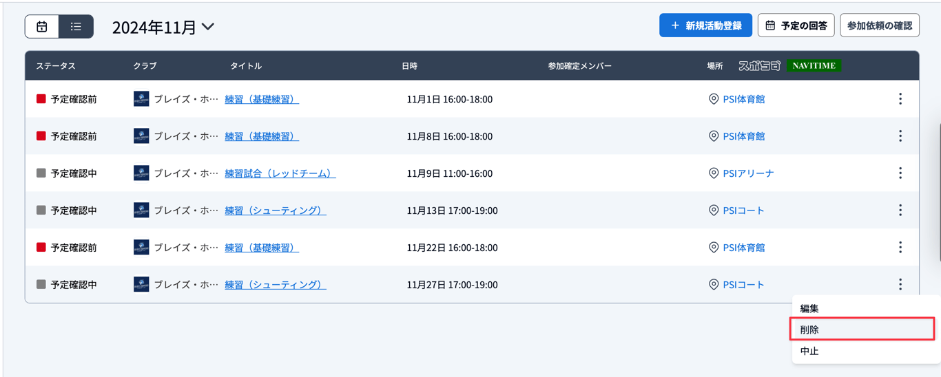 活動一覧の削除する予定の横にある「︙」をクリックし、「削除」をクリックする