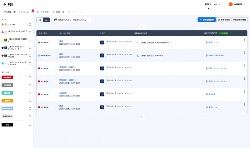 「管理・設定」>「クラブ管理」を開きます。