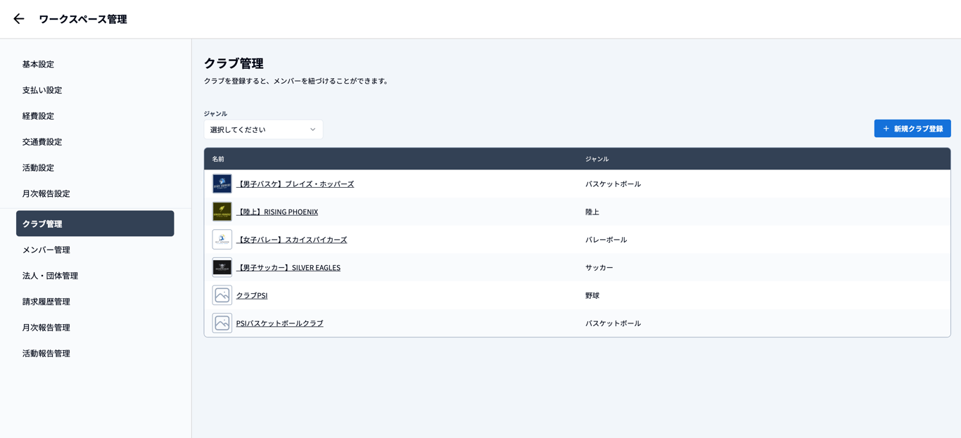 ワークスペースに属するクラブを登録します。