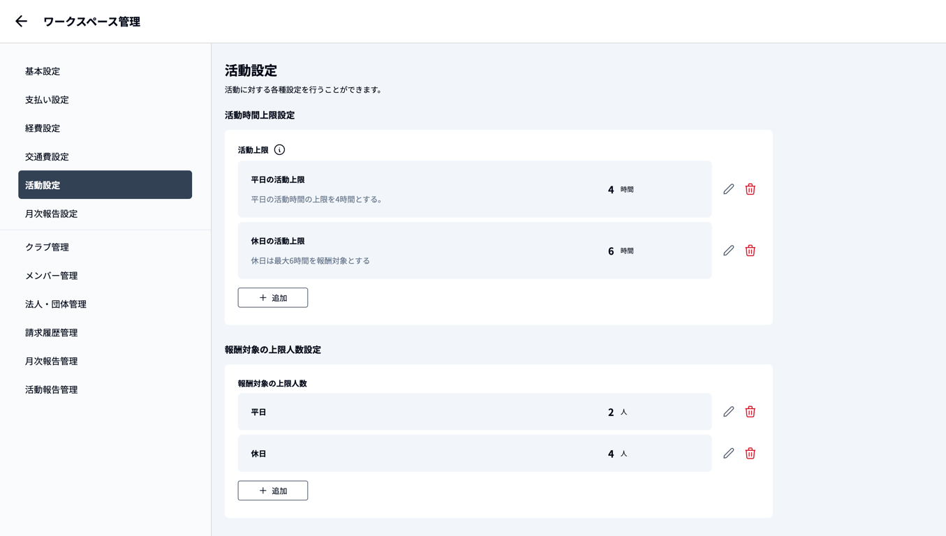 活動において、活動時間や活動人数に報酬の上限を設ける場合、設定することができます。