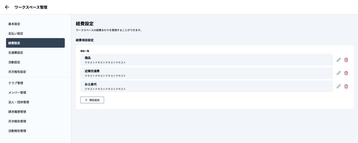 指導者の方々が経費申請を行う際に選択する経費項目の設定をします。