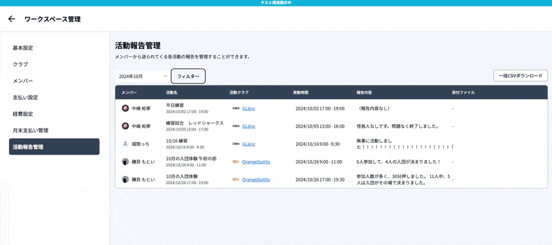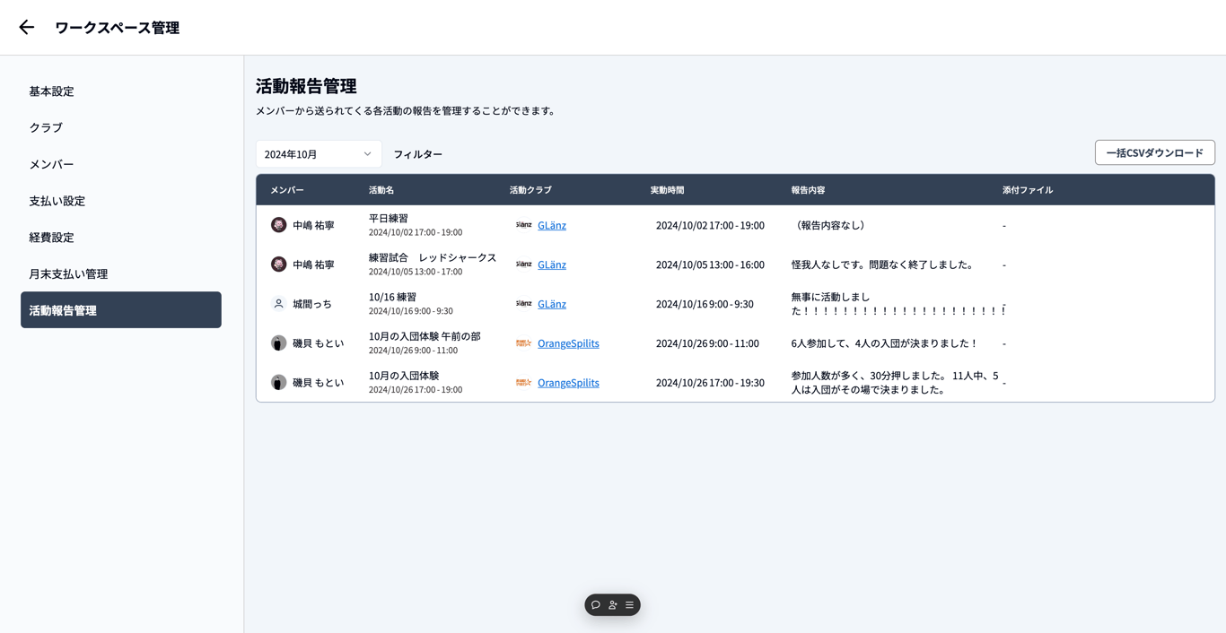 提出された活動報告は、活動クラブ単位でフィルターをかけることができる